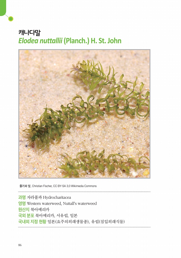 86 캐나다말 Elodea nuttallii Planch. H. St. John 과명 자라풀과 Hydrocharitacea 영명 Western waterweed, Nuttalls waterweed 원산지 북아메리카 국외 분포 북아메리카, 서유럽, 일본 국내외 지정 현황 일본 요주의외래생물종 , 유럽 침입외래식물 줄기와 잎. Christian Fischer, CC BY-SA 3.0 WikimediaCommons
