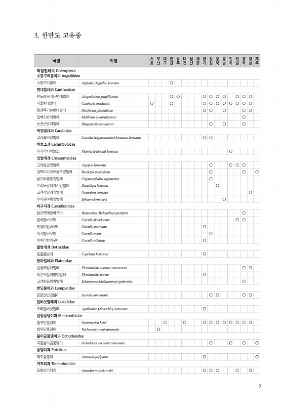 9 3. 한반도 고유종 국명 학명 서 울 부산 대구 인천 광주 대전 울산 세종 경기 강원 충북 충남 전북 전남 경북 경남 제주 딱정벌레목 Coleoptera 소똥구리붙이과 Aegialiidae 소똥구리붙이 Aegialia Aegialia koreana ○ 병대벌레과 Cantharidae 연노랑목가는병대벌레 Asiopodabrus fragiliformis ○ ○ ○ ○ ○ ○ ○ ○ ○ 서울병대벌레 Cantharis soeulensis ○ ○ ○ ○ ○ ○ ○ ○ ○ ○ 등점목가는병대벌레 Hatchiana glochidiatus ○ ○ ○ ○ ○ 밑빠진병대벌레 Malthinus quadratipennis ○ 눈큰산병대벌레 Rhagonycha koreaensis ○ ○ ○ 딱정벌레과 Carabidae 고려줄딱정...
