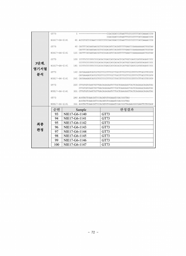 72 3단계. 염기서열 분석 최종 판정 순번 Sample 판정결과 93 NIE17-G6-1140 GT73 94 NIE17-G6-1141 GT73 95 NIE17-G6-1142 GT73 96 NIE17-G6-1143 GT73 97 NIE17-G6-1144 GT73 98 NIE17-G6-1145 GT73 99 NIE17-G6-1146 GT73 100 NIE17-G6-1147GT73