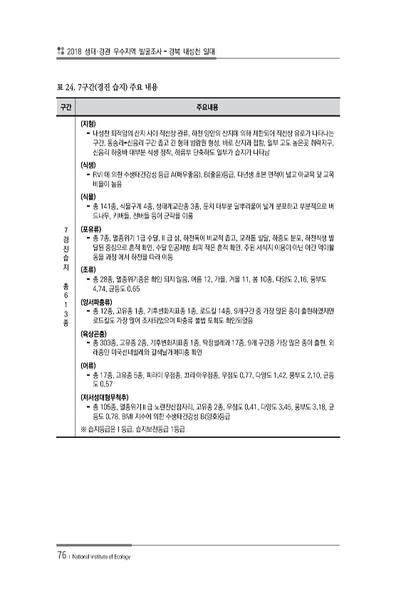 2018 생태·경관 우수지역 발굴조사 경북 내성천 일대 76 ? National Institute of Ecology 구간 주요내용 7 경 진 습 지 총 6 1 3 종 지형 내성천 퇴적암의 산지 사이 직선상 관류, 하천 양안의 산지에 의해 제한되어 직선상 유로가 나타나는 구간, 동송리-신음리 구간 좁고 긴 형태 범람원 형성, 바로 산지과 접함, 일부 고도 높은곳 취락지구, 신음리 하중바 대부분 식생 정착, 하류부 단축하도 일부가 습지가 나타남 식생 RVI 에 의한 수생태건강성 등급 A 매우좋음 , B 좋음 등급, 다년생 초본 면적이 넓고 아교목 및 교목 비율이 높음 식물 총 141종, 식물구계 4종, 생태계교란종 3종, 둔치 대부분 달뿌리풀이 넓게 분포하고 부분적으로 버 드나무, 키버들, 선버들 등이 군락을...