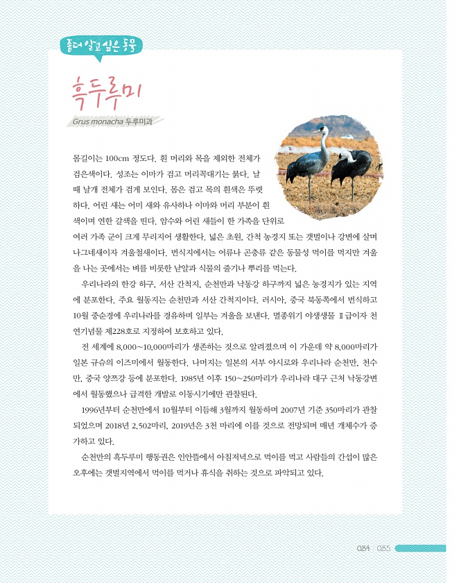 084 085 좀더알고싶은동물 흑두루미 몸길이는 100cm 정도다. 흰 머리와 목을 제외한 전체가 검은색이다. 성조는 이마가 검고 머리꼭대기는 붉다. 날 때 날개 전체가 검게 보인다. 몸은 검고 목의 흰색은 뚜렷 하다. 어린 새는 어미 새와 유사하나 이마와 머리 부분이 흰 색이며 연한 갈색을 띤다. 암수와 어린 새들이 한 가족을 단위로 여러 가족 군이 크게 무리지어 생활한다. 넓은 초원, 간척 농경지 또는 갯벌이나 강변에 살며 나그네새이자 겨울철새이다. 번식지에서는 어류나 곤충류 같은 동물성 먹이를 먹지만 겨울 을 나는 곳에서는 벼를 비롯한 낟알과 식물의 줄기나 뿌리를 먹는다. 우리나라의 한강 하구, 서산 간척지, 순천만과 낙동강 하구까지 넓은 농경지가 있는 지역 에 분포한다. 주요 월동지는 순천만과 서산 ...