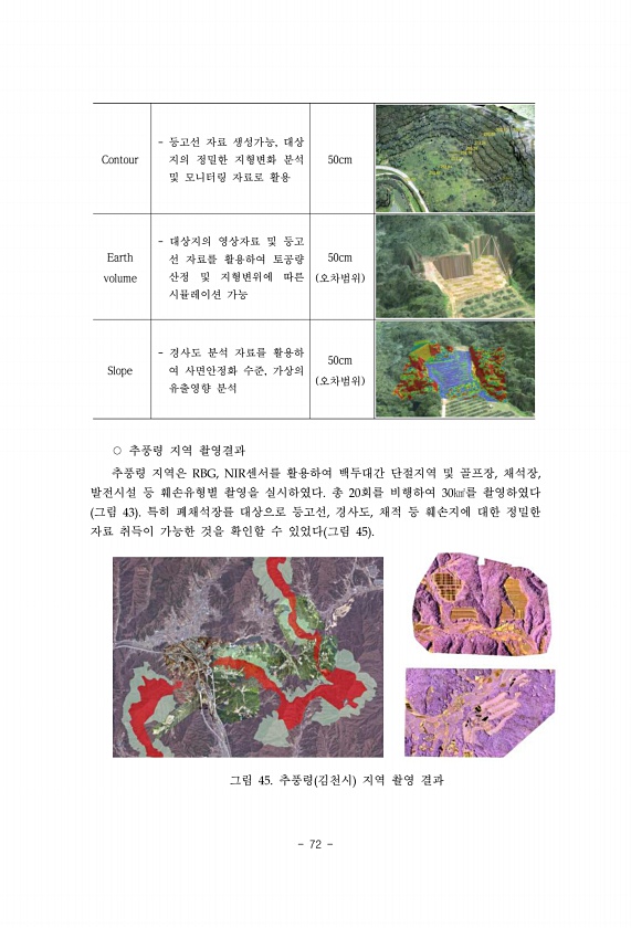 72 ○ 추풍령 지역 촬영결과 추풍령 지역은 RBG, NIR센서를 활용하여 백두대간 단절지역 및 골프장, 채석장, 발전시설 등 훼손유형별 촬영을 실시하였다. 총 20회를 비행하여 30㎢를 촬영하였다 그림 43 특히 폐채석장를 대상으로 등고선, 경사도, 채적 등 훼손지에 대한 정밀한 자료 취득이 가능한 것을 확인할 수 있었다 그림 45 그림 45. 추풍령 김천시 지역 촬영 결과 Contour 등고선 자료 생성가능, 대상 지의 정밀한 지형변화 분석 및 모니터링 자료로 활용 50cm Earth volume 대상지의 영상자료 및 등고 선 자료를 활용하여 토공량 산정 및 지형변위에 따른 시뮬레이션 가능 50cm 오차범위 Slope 경사도 분석 자료를 활용하 여 사면안정화 수준, 가상의 유출영향 분석 50cm 오차범위