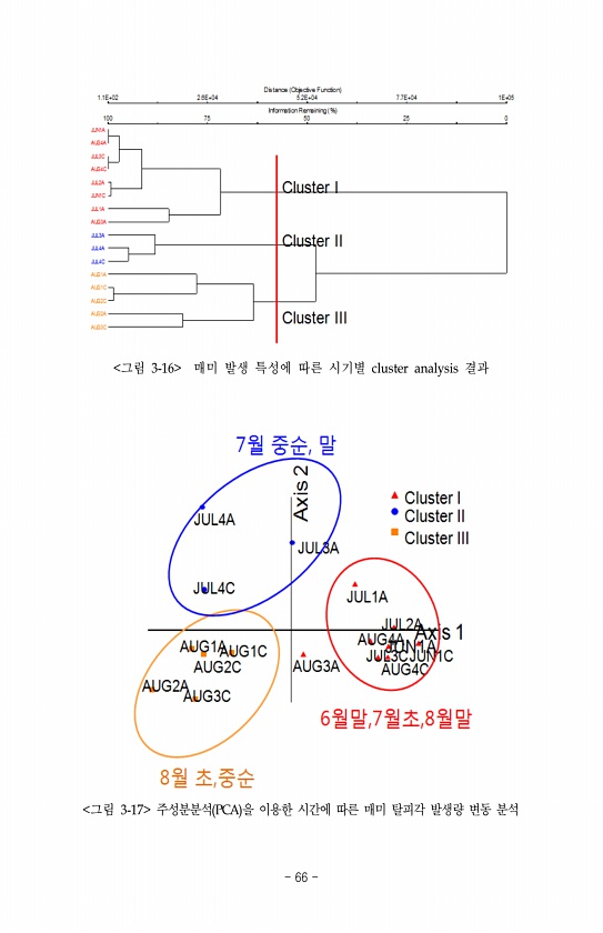 그림 3-16 매미 발생 특성에 따른 시기별 cluster analysis 결과 그림 3-17 주성분분석 PCA 을 이용한 시간에 따른 매미 탈피각 발생량 변동 분석 66