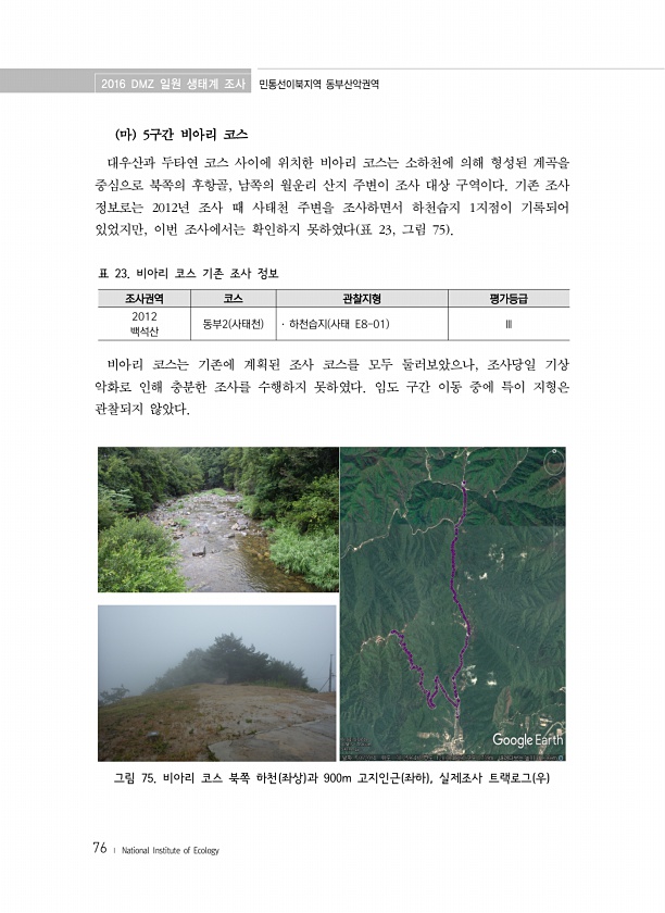 2016 DMZ 일원 생태계 조사 민통선이북지역 동부산악권역 76 ? National Institute of Ecology 마 5구간 비아리 코스 대우산과 두타연 코스 사이에 위치한 비아리 코스는 소하천에 의해 형성된 계곡을 중심으로 북쪽의 후항골, 남쪽의 월운리 산지 주변이 조사 대상 구역이다. 기존 조사 정보로는 2012년 조사 때 사태천 주변을 조사하면서 하천습지 1지점이 기록되어 있었지만, 이번 조사에서는 확인하지 못하였다 표 23, 그림 75 조사권역 코스 관찰지형 평가등급 2012 백석산 동부2 사태천 ? 하천습지 사태 E8-01 Ⅲ 표 23. 비아리 코스 기존 조사 정보 비아리 코스는 기존에 계획된 조사 코스를 모두 둘러보았으나, 조사당일 기상 악화로 인해 충분한 조사를 수행하지 못하였다. 임도...
