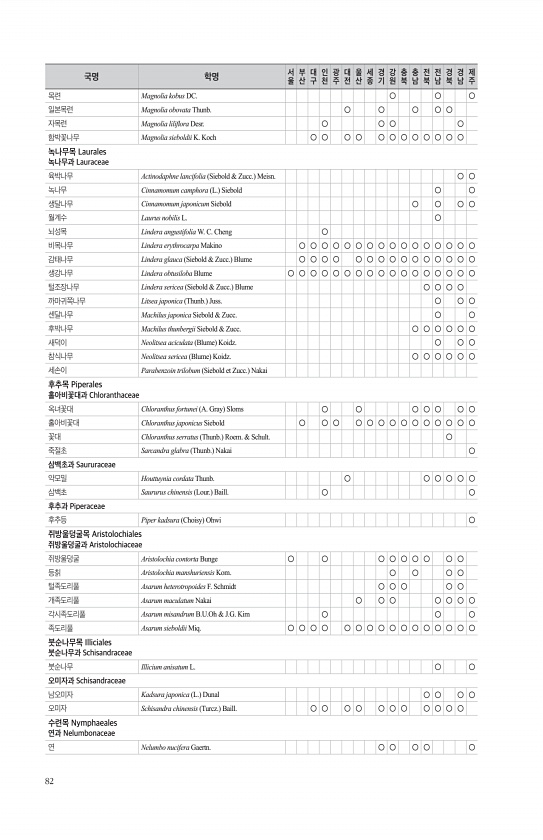 82 목련 Magnolia kobus DC. ○ ○ ○ 일본목련 Magnolia obovata Thunb. ○ ○ ○ ○ ○ 자목련 Magnolia lilifora Desr. ○ ○ ○ ○ 함박꽃나무 Magnolia sieboldii K. Koch ○ ○ ○ ○ ○ ○ ○ ○ ○ ○ ○ ○ 녹나무목 Laurales 녹나무과 Lauraceae 육박나무 Actinodaphne lancifolia Siebold & Zucc. Meisn. ○ ○ 녹나무 Cinnamomum camphora L. Siebold ○ ○ 생달나무 Cinnamomum japonicum Siebold ○ ○ ○ ○ 월계수 Laurus nobilis L. ○ 뇌성목 Lindera angustifolia W. C. Cheng ○ 비목나무 Lin...
