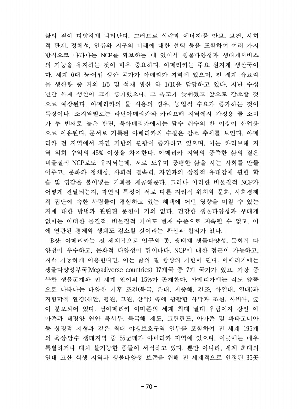70 삶의 질이 다양하게 나타난다. 그러므로 식량과 에너지?물 안보, 보건, 사회 적 관계, 정체성, 인류와 지구의 미래에 대한 선택 등을 포함하여 여러 가지 방식으로 나타나는 NCP를 확보하는 데 있어서 생물다양성과 생태계서비스 의 기능을 유지하는 것이 매우 중요하다. 아메리카는 주요 원자재 생산국이 다. 세계 6대 농?어업 생산 국가가 아메리카 지역에 있으며, 전 세계 유료작 물 생산량 중 거의 1/5 및 석재 생산 약 1/10을 담당하고 있다. 지난 수십 년간 목재 생산이 크게 증가했으나, 그 속도가 늦춰졌고 앞으로 감소할 것 으로 예상된다. 아메리카의 물 사용의 경우, 농업적 수요가 증가하는 것이 특징이다. 소지역별로는 라틴아메리카와 카리브해 지역에서 가정용 물 소비 가 두 번째로 높은 반면, 북아메...