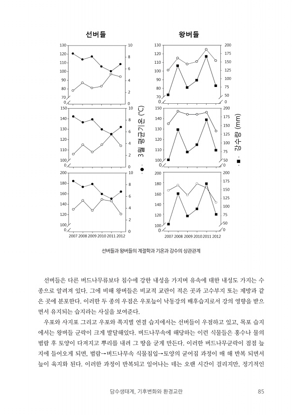 담수생태계, 기후변화와 환경교란 85 선버들과 왕버들의 계절학과 기온과 강수의 상관관계 선버들은 다른 버드나무류보다 침수에 강한 내성을 가지며 유속에 대한 내성도 가지는 수 종으로 알려져 있다. 그에 비해 왕버들은 비교적 교란이 적은 곳과 고수부지 또는 제방과 같 은 곳에 분포한다. 이러한 두 종의 우점은 우포늪이 낙동강의 배후습지로서 강의 영향을 받으 면서 유지되는 습지라는 사실을 보여준다. 우포와 사지포 그리고 우포와 쪽지벌 연결 습지에서는 선버들이 우점하고 있고, 목포 습지 에서는 왕버들 군락이 크게 발달해있다. 버드나무속에 해당하는 이런 식물들은 홍수나 물의 범람 후 토양이 다져지고 뿌리를 내려 그 땅을 굳게 만든다. 이러한 버드나무군락이 점점 늪 지에 들어오게 되면, 범람→버드나무속 식물침입→토양의...