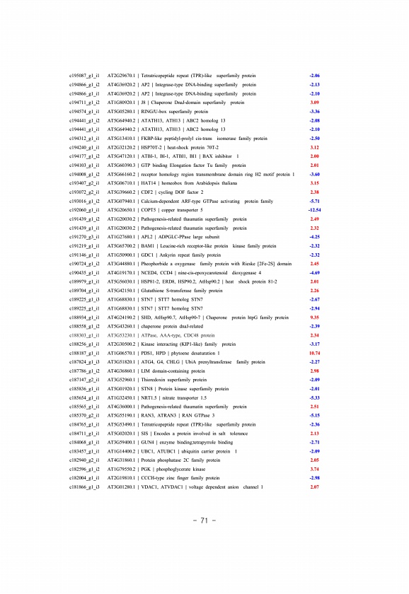 71 c195087_g1_i1 AT2G29670.1 | Tetratricopeptide repeat TPR -like superfamily protein -2.06 c194866_g1_i2 AT4G36920.2 | AP2 | Integrase-type DNA-binding superfamily protein -2.13 c194866_g1_i1 AT4G36920.2 | AP2 | Integrase-type DNA-binding superfamily protein -2.10 c194711_g1_i2 AT1G80920.1 | J8 | Chaperone DnaJ-domain superfamily protein 3.09 c194574_g1_i1 AT5G05280.1 | RING/U-box superfamily pro...