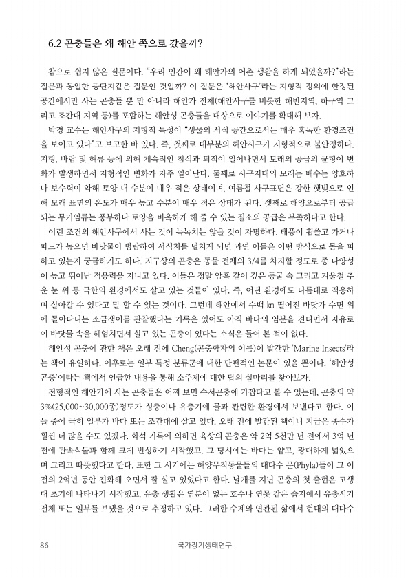 86 국가장기생태연구 6.2 곤충들은 왜 해안 쪽으로 갔을까? 참으로 쉽지 않은 질문이다. “우리 인간이 왜 해안가의 어촌 생활을 하게 되었을까?”라는 질문과 동일한 뚱딴지같은 질문인 것일까? 이 질문은 ‘해안사구’라는 지형적 정의에 한정된 공간에서만 사는 곤충들 뿐 만 아니라 해안가 전체 해안사구를 비롯한 해빈지역, 하구역 그 리고 조간대 지역 등 를 포함하는 해안성 곤충들을 대상으로 이야기를 확대해 보자. 박경 교수는 해안사구의 지형적 특성이 “생물의 서식 공간으로서는 매우 혹독한 환경조건 을 보이고 있다”고 보고한 바 있다. 즉, 첫째로 대부분의 해안사구가 지형적으로 불안정하다. 지형, 바람 및 해류 등에 의해 계속적인 침식과 퇴적이 일어나면서 모래의 공급의 균형이 변 화가 발생하면서 지형적인 변화가 ...