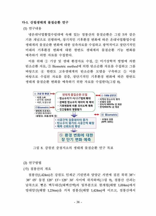 38 다-1. 산림생태계 물질순환 연구 1 연구내용 냉온대낙엽활엽수림대에 속해 있는 점봉산의 물질순환은 그림 5과 같은 기본 개념으로 진행하며, 장기적인 기후환경 변화에 따른 온대낙엽활엽수림 생태계의 물질순환 변화에 대한 실측자료를 수집하고 광역적이고 장단기적인 미래의 기후환경 변화에 대한 한반도 생태계의 물질순환 기능 변화를 예측하기 위한 자료를 수집한다. 이를 위해 ① 기상 및 생태 환경자료 수집, ② 미기상학적 방법에 의한 탄소순환 자료, ③ Biometric method에 의한 탄소순환 자료를 수집하고 그를 바탕으로 ④ 한반도 고유생태계의 탄소순환 모델을 구축하고 ⑤ 이를 바탕으로 수집된 자료를 검증, 장단기적인 기후환경 변화에 따른 한반도 생태계 물질순환 변화를 예측하기 위한 자료를 수집한다 그림 ...