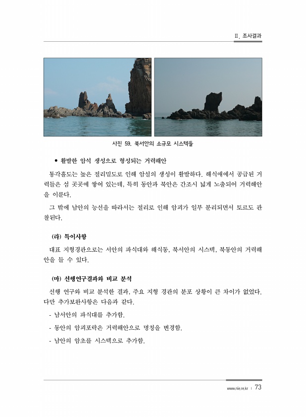 Ⅱ. 조사결과 www.nie.re.kr ? 73 사진 59. 북서안의 소규모 시스텍들 ? 활발한 암석 생성으로 형성되는 거력해안 통각흘도는 높은 절리밀도로 인해 암설의 생성이 활발하다. 해식애에서 공급된 거 력들은 섬 곳곳에 쌓여 있는데, 특히 동안과 북안은 간조시 넓게 노출되어 거력해안 을 이룬다. 그 밖에 남안의 능선을 따라서는 절리로 인해 암괴가 일부 분리되면서 토르도 관 찰된다. 라 특이사항 대표 지형경관으로는 서안의 파식대와 해식동, 북서안의 시스텍, 북동안의 거력해 안을 들 수 있다. 마 선행연구결과와 비교 분석 선행 연구와 비교 분석한 결과, 주요 지형 경관의 분포 상황이 큰 차이가 없었다. 다만 추가보완사항은 다음과 같다. 남서안의 파식대를 추가함. 동안의 암괴포락은 거력해안으로 명칭을 변경함...