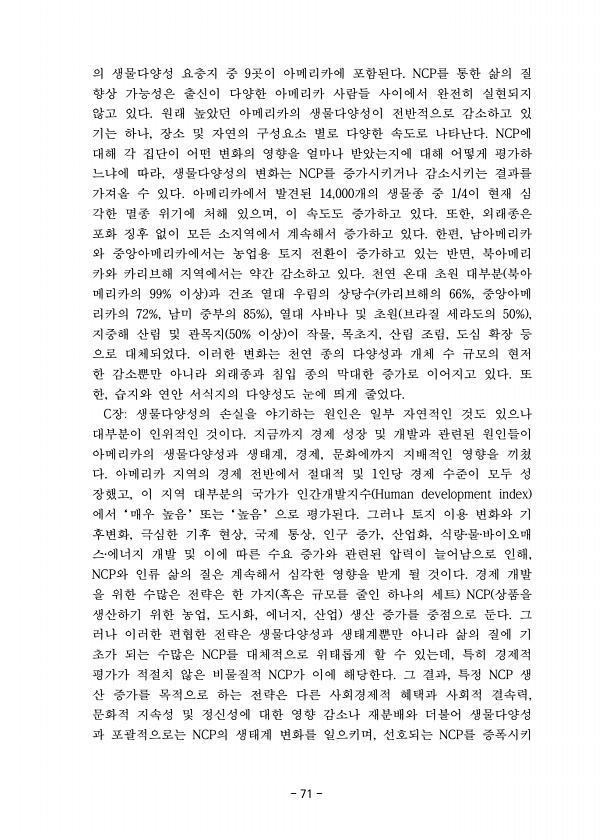 71 의 생물다양성 요충지 중 9곳이 아메리카에 포함된다. NCP를 통한 삶의 질 향상 가능성은 출신이 다양한 아메리카 사람들 사이에서 완전히 실현되지 않고 있다. 원래 높았던 아메리카의 생물다양성이 전반적으로 감소하고 있 기는 하나, 장소 및 자연의 구성요소 별로 다양한 속도로 나타난다. NCP에 대해 각 집단이 어떤 변화의 영향을 얼마나 받았는지에 대해 어떻게 평가하 느냐에 따라, 생물다양성의 변화는 NCP를 증가시키거나 감소시키는 결과를 가져올 수 있다. 아메리카에서 발견된 14,000개의 생물종 중 1/4이 현재 심 각한 멸종 위기에 처해 있으며, 이 속도도 증가하고 있다. 또한, 외래종은 포화 징후 없이 모든 소지역에서 계속해서 증가하고 있다. 한편, 남아메리카 와 중앙아메리카에서는 농업용 토지 전...
