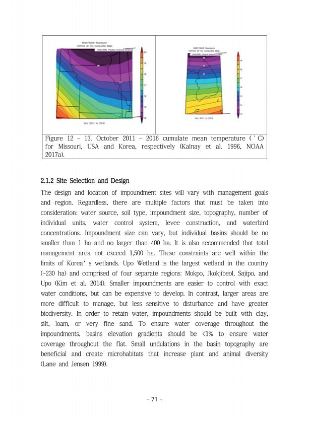 71 Figure 12 ? 13. October 2011 ? 2016 cumulate mean temperature ˚C for Missouri, USA and Korea, respectively Kalnay et al. 1996, NOAA 2017a 2.1.2 Site Selection and Design The design and location of impoundment sites will vary with management goals and region. Regardless, there are multiple factors that must be taken into considerationwater source, soil type, impoundment size, topography, number ...