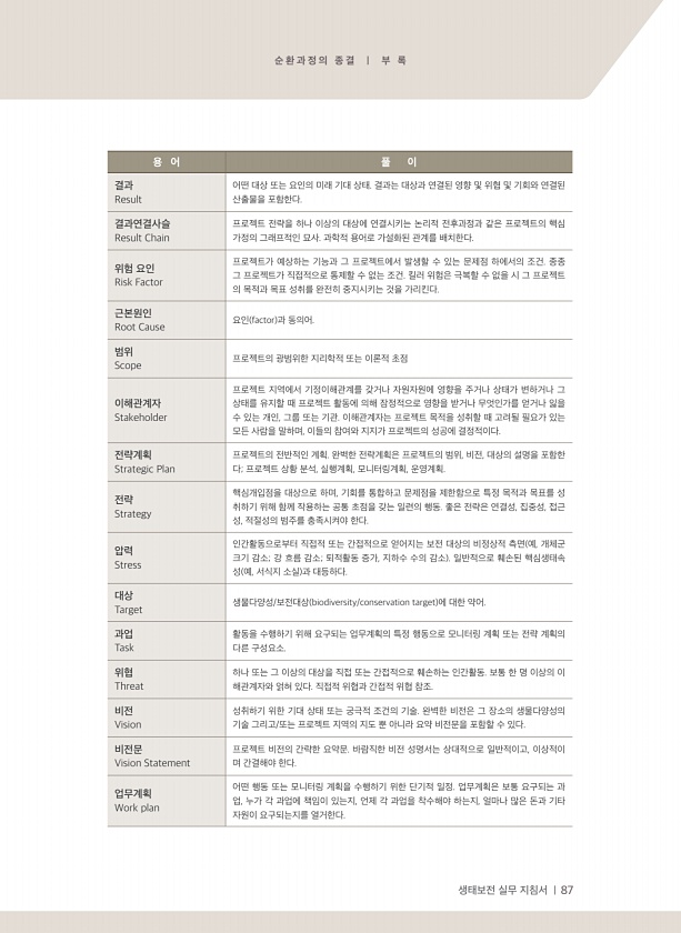 생태보전 실무 지침서 | 87 순 환 과 정 의 종 결 | 부 록 용 어 풀 이 결과 Result 어떤 대상 또는 요인의 미래 기대 상태. 결과는 대상과 연결된 영향 및 위협 및 기회와 연결된 산출물을 포함한다. 결과연결사슬 Result Chain 프로젝트 전략을 하나 이상의 대상에 연결시키는 논리적 전후과정과 같은 프로젝트의 핵심 가정의 그래프적인 묘사. 과학적 용어로 가설화된 관계를 배치한다. 위험 요인 Risk Factor 프로젝트가 예상하는 기능과 그 프로젝트에서 발생할 수 있는 문제점 하에서의 조건. 종종 그 프로젝트가 직접적으로 통제할 수 없는 조건. 킬러 위험은 극복할 수 없을 시 그 프로젝트 의 목적과 목표 성취를 완전히 중지시키는 것을 가리킨다. 근본원인 Root Cause 요인 factor...