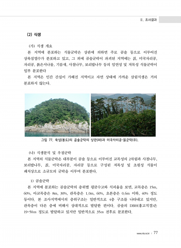 Ⅱ. 조사결과 www.nie.re.kr ? 77 2 식생 가 식생 개요 본 지역에 분포하는 식물군락은 상관에 의하면 주로 곰솔 등으로 이루어진 상록침엽수가 분포하고 있고, 그 외에 곰솔군락이 파괴된 지역에는 칡, 미국자리공, 자리공, 붉은서나물, 기름새, 사철나무, 보리밥나무 등의 임연성 및 저목성 식물군락이 일부 분포한다 본 지역은 인간 간섭이 가해진 지역이고 자연 상태에 가까운 삼림식생은 거의 분포하지 않는다. 그림 77. 쑥섬 봉도 의 곰솔군락의 상관 좌 과 미국자리공-칡군락 우 나 식생분석 및 우점군락 본 지역의 식물군락은 대부분이 곰솔 등으로 이루어진 교목성의 2차림과 사철나무, 보리밥나무, 칡, 미국자리공, 자리공 등으로 구성된 저목성 및 초원성 식물이 패치상으로 소규모의 군락을 이루며 분포한다....