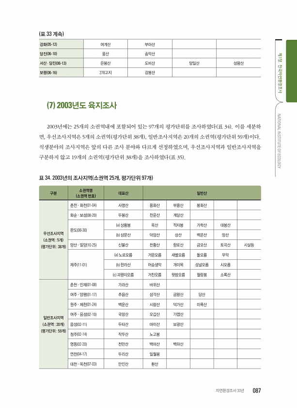 강화 05-12 여계산 부아산 당진 06-10 웅산 송악산 서산 · 당진 06-13 은봉산 도비산 망일산 성왕산 보령 06-16 278고지 감봉산 7 2003년도 육지조사 2003년에는 25개의 소권역내에 포함되어 있는 97개의 평가단위를 조사하였다 표 34 이를 세분하 면, 우선조사지역은 5개의 소권역 평가단위 38개 , 일반조사지역은 20개의 소권역 평가단위 59개 이다. 식생분야의 조사지역은 앞의 다른 조사 분야와 다르게 선정하였으며, 우선조사지역과 일반조사지역을 구분하지 않고 19개의 소권역 평가단위 38개 을 조사하였다 표 35 표 34. 2003년의 조사지역 소권역 25개, 평가단위 97개 구분 소권역명 소권역 번호 대표산 일반산 우선조사지역 소권역 5개 평가단위 38개 춘천 · 화천 01-04 ...