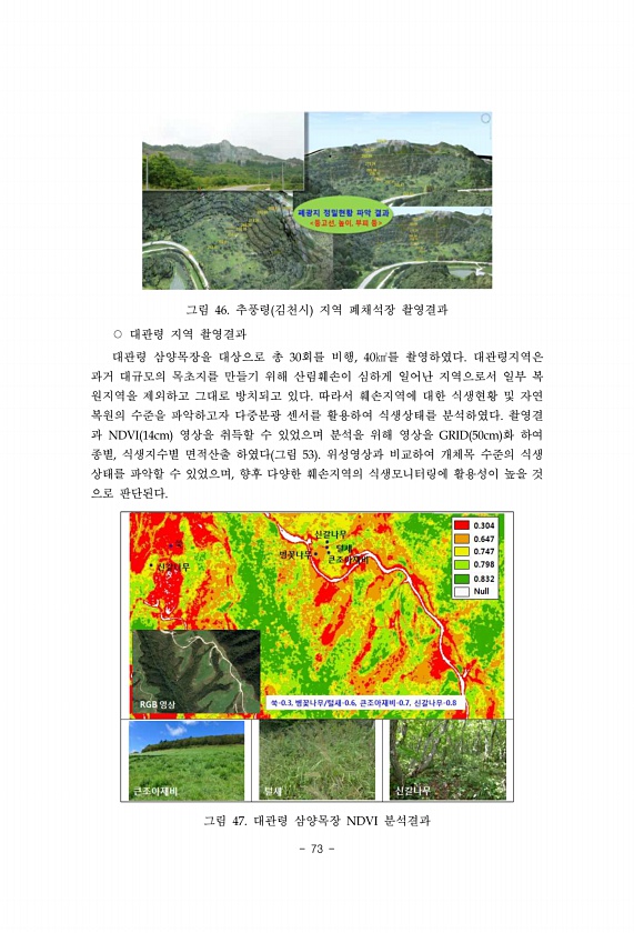 73 그림 46. 추풍령 김천시 지역 폐채석장 촬영결과 ○ 대관령 지역 촬영결과 대관령 삼양목장을 대상으로 총 30회를 비행, 40㎢를 촬영하였다. 대관령지역은 과거 대규모의 목초지를 만들기 위해 산림훼손이 심하게 일어난 지역으로서 일부 복 원지역을 제외하고 그대로 방치되고 있다. 따라서 훼손지역에 대한 식생현황 및 자연 복원의 수준을 파악하고자 다중분광 센서를 활용하여 식생상태를 분석하였다. 촬영결 과 NDVI 14cm 영상을 취득할 수 있었으며 분석을 위해 영상을 GRID 50cm 화 하여 종별, 식생지수별 면적산출 하였다 그림 53 위성영상과 비교하여 개체목 수준의 식생 상태를 파악할 수 있었으며, 향후 다양한 훼손지역의 식생모니터링에 활용성이 높을 것 으로 판단된다. 그림 47. 대관령 삼양목장 ND...