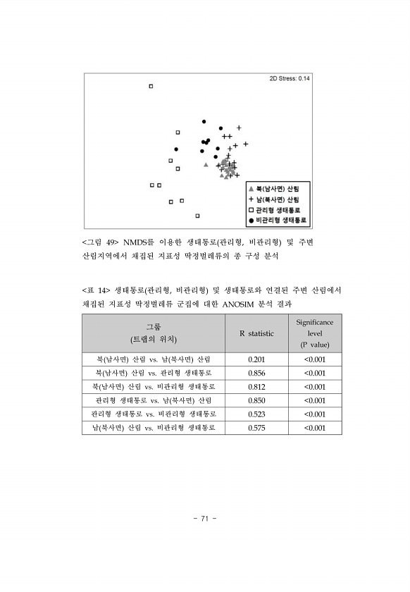 71 그림 49 NMDS를 이용한 생태통로 관리형, 비관리형 및 주변 산림지역에서 채집된 지표성 딱정벌레류의 종 구성 분석 그룹 트랩의 위치 R statistic Significance level P value 북 남사면 산림 vs. 남 북사면 산림 0.201 0.001 북 남사면 산림 vs. 관리형 생태통로 0.856 0.001 북 남사면 산림 vs. 비관리형 생태통로 0.812 0.001 관리형 생태통로 vs. 남 북사면 산림 0.850 0.001 관리형 생태통로 vs. 비관리형 생태통로 0.523 0.001 남 북사면 산림 vs. 비관리형 생태통로 0.575 0.001 표 14 생태통로 관리형, 비관리형 및 생태통로와 연결된 주변 산림에서 채집된 지표성 딱정벌레류 군집에 대한 ANOSIM 분석결과