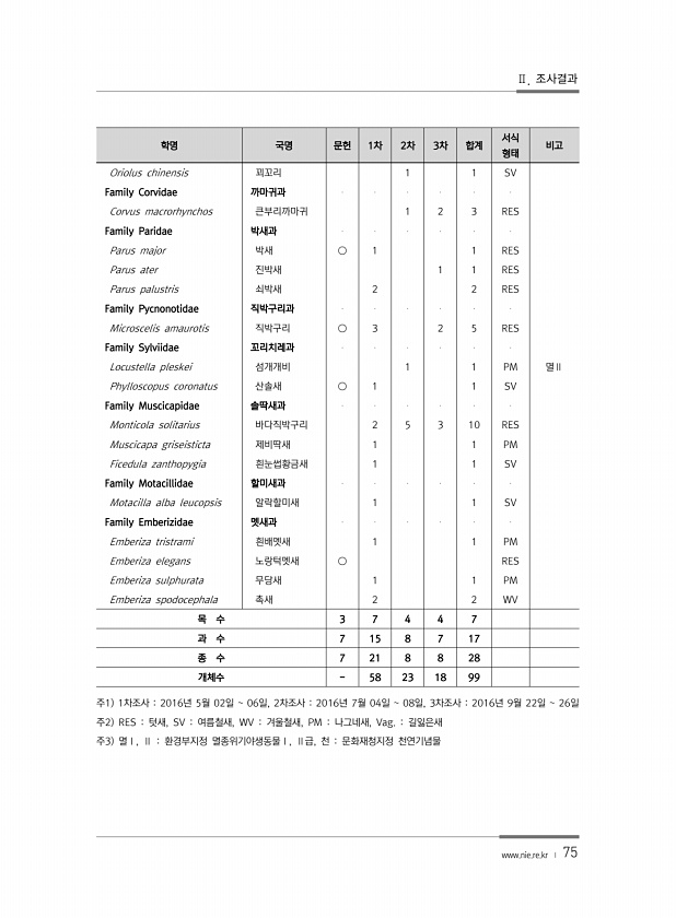 Ⅱ. 조사결과 www.nie.re.kr ? 75 학명 국명 문헌 1차 2차 3차 합계 서식 형태 비고 Oriolus chinensis 꾀꼬리 1 1 SV Family Corvidae 까마귀과 Corvus macrorhynchos 큰부리까마귀 1 2 3 RES Family Paridae 박새과 Parus major 박새 ○ 1 1 RES Parus ater 진박새 1 1 RES Parus palustris 쇠박새 2 2 RES Family Pycnonotidae 직박구리과 Microscelis amaurotis 직박구리 ○ 3 2 5 RES Family Sylviidae 꼬리치레과 Locustella pleskei 섬개개비 1 1 PM 멸Ⅱ Phylloscopus coronatus 산솔새 ○ 1 1 SV Fa...