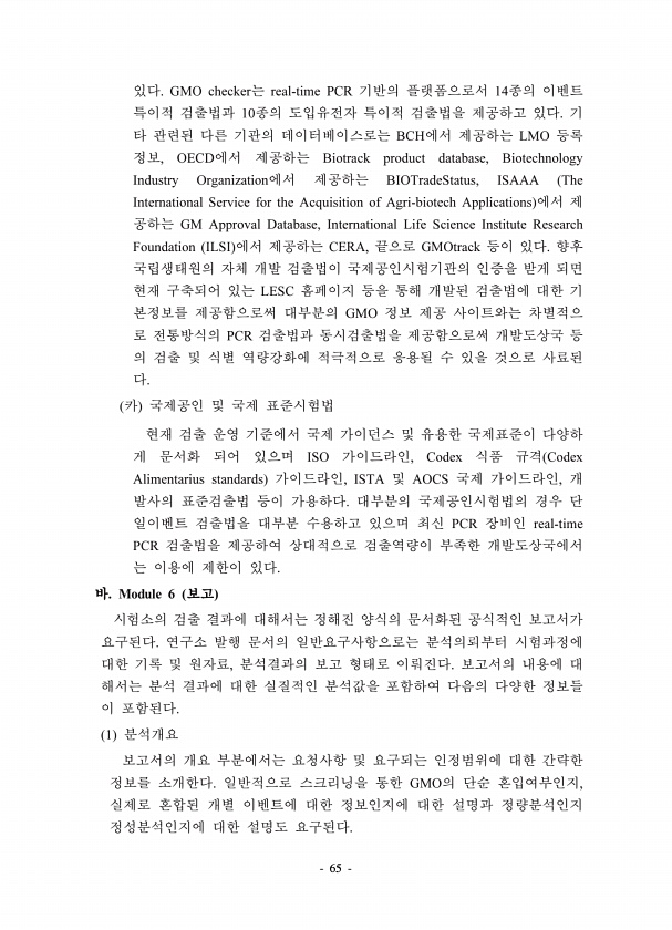 65 GMO checker real-time PCR 14 10 BCH LMO , OECD Biotrack product database, Biotechnology Industry Organization BIOTradeStatus, ISAAA The International Service for the Acquisition of Agri-biotech Applications GM Approval Database, International Life Science Institute Research Foundation ILSI CERA, GMOtrack LESC GMO PCR ISO , Codex Codex Alimentarius standards , ISTA AOCS , PCR real-time PCR Modul...