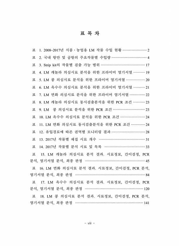 viii 표 목 차 표 1. 20082017년 식품 농업용 LM 작물 수입 현황 ·························· 2 표 2. 국내 항만 및 공항의 주요작물별 수입량 ······································ 4 표 3. Strip kit의 작물별 검출 가능 범위 ················································ 17 표 4. LM 캐놀라 의심시료 분석을 위한 프라이머 염기서열 ············ 19 표 5. LM 콩 의심시료 분석을 위한 프라이머 염기서열 ···················· 20 표 6. LM 옥수수 의심시료 분석을 위한 프라이머 염기서열 ············ 21 표 7. LM 면화 의심시료 분석을 위...