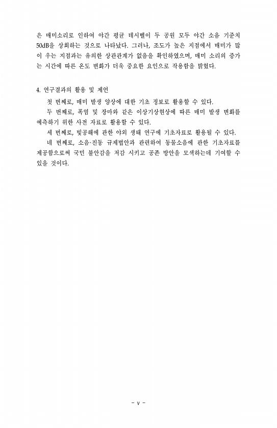 은 매미소리로 인하여 야간 평균 데시벨이 두 공원 모두 야간 소음 기준치 50dB을 상회하는 것으로 나타났다. 그러나, 조도가 높은 지점에서 매미가 많 이 우는 지점과는 유의한 상관관계가 없음을 확인하였으며, 매미 소리의 증가 는 시간에 따른 온도 변화가 더욱 중요한 요인으로 작용함을 밝혔다. 4. 연구결과의 활용 및 제언 첫 번째로, 매미 발생 양상에 대한 기초 정보로 활용할 수 있다. 두 번째로, 폭염 및 장마와 같은 이상기상현상에 따른 매미 발생 변화를 예측하기 위한 사전 자료로 활용할 수 있다. 세 번째로, 빛공해에 관한 야외 생태 연구에 기초자료로 활용될 수 있다. 네 번째로, 소음·진동 규제법안과 관련하여 동물소음에 관한 기초자료를 제공함으로써 국민 불안감을 저감 시키고 공존 방안을 모색하는데 기...