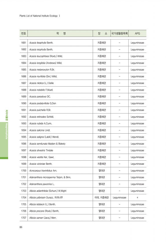 86 번호 학 명 장 소 국가생물종목록 APG 피자식물문 Magnoliophyta Plants List of National Institute Ecology Ⅰ 1681 Acacia iteaphylla Benth. 지중해관 Leguminosae 1682 Acacia ixiophylla Benth. 지중해관 Leguminosae 1683 Acacia leucophloea Roxb. Willd. 지중해관 Leguminosae 1684 Acacia longifolia Andrews Willd. 지중해관 Leguminosae 1685 Acacia melanoxylon R.Br. 지중해관 Leguminosae 1686 Acacia myrtifolia Sm. Willd. 지중해관 Leguminosae 1687 Acac...