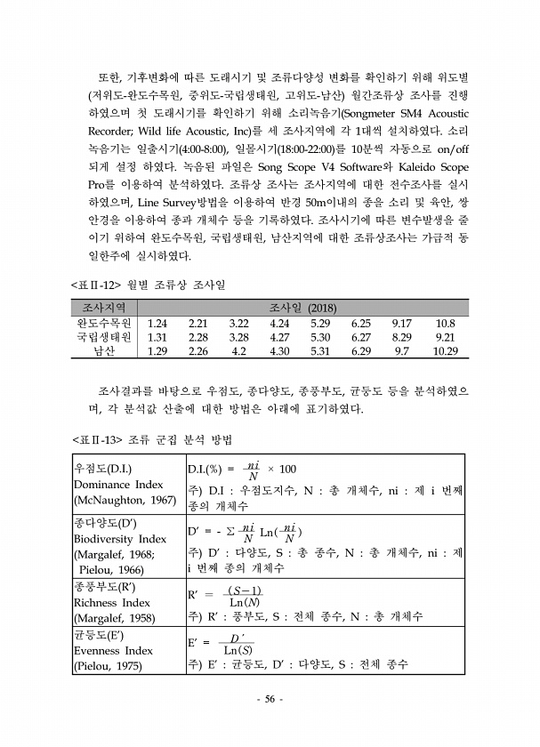56 또한, 기후변화에 따른 도래시기 및 조류다양성 변화를 확인하기 위해 위도별 저위도-완도수목원, 중위도-국립생태원, 고위도-남산 월간조류상 조사를 진행 하였으며 첫 도래시기를 확인하기 위해 소리녹음기 Songmeter SM4 Acoustic Recorder; Wild life Acoustic, Inc 를 세 조사지역에 각 1대씩 설치하였다. 소리 녹음기는 일출시기 400-800 , 일몰시기 1800-2200 를 10분씩 자동으로 on/off 되게 설정 하였다. 녹음된 파일은 Song Scope V4 Software와 Kaleido Scope Pro를 이용하여 분석하였다. 조류상 조사는 조사지역에 대한 전수조사를 실시 하였으며, Line Survey방법을 이용하여 반경 50m이내의 종을 소리 및 육안, 쌍...