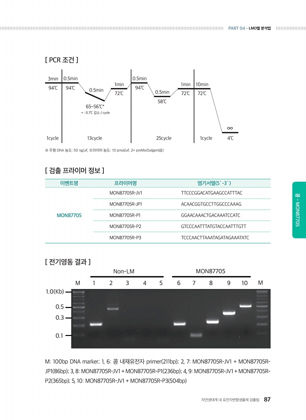 자연생태계 내 유전자변형생물체 검출법 87 PART 04?LMO별 분석법 콩?MON87705 [ 검출 프라이머 정보 ] 이벤트명 프라이머명 염기서열 5`-3` MON87705 MON87705R-JV1 TTCCCGGACATGAAGCCATTTAC MON87705R-JP1 ACAACGGTGCCTTGGCCCAAAG MON87705R-P1 GGAACAAACTGACAAATCCATC MON87705R-P2 GTCCCAATTTATGTACCAATTTGTT MON87705R-P3 TCCCAACTTAAATAGATAGAAATATC M100bp DNA marker; 1, 6콩 내재유전자 primer 211bp ; 2, 7MON87705R-JV1 + MON87705RJP1 86bp ; 3, 8MON87705R-JV1 + MON877...