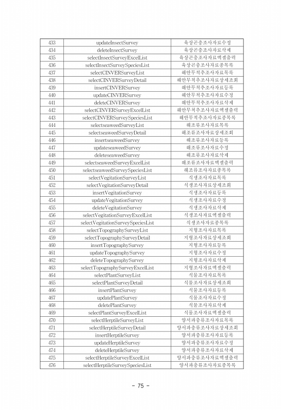 75 433 updateInsectSurvey 육상곤충조사자료수정 434 deleteInsectSurvey 육상곤충조사자료@A 432 selectInsectSurveyExcelList 육상곤충조사자료abcd 437 selectInsectSurveySpeciesList 육상곤충조사자료n목록 439 selectCINVERSurveyList 해안무척추조사자료목록 43? selectCINVERSurvey3etail 해안무척추조사자료상5조0 43B insertCINVERSurvey 해안무척추조사자료8록 44G updateCINVERSurvey 해안무척추조사자료수정? deleteCINVERSurvey 해안무척추조사자료? selectCINVERSurveyExcelList 해안무척추조사자료abcd 443 selectCIN...