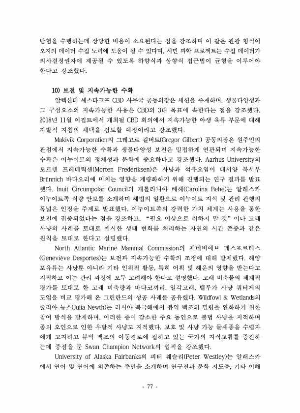 77 탐험을 수행하는데 상당한 비용이 소요된다는 점을 강조하며 이 같은 관광 형식이 오지의 데이터 수집 노력에 도움이 될 수 있다며, 시민 과학 프로젝트는 수집 데이터가 의사결정권자에 제공될 수 있도록 하향식과 상향식 접근법이 균형을 이루어야 한다고 강조했다. 10 보전 및 지속가능한 수확 알렉산더 셰스타코프 CBD 사무국 공동의장은 세션을 주재하며, 생물다양성과 그 구성요소의 지속가능한 사용은 CBD의 3대 목표에 속한다는 점을 강조했다. 2018년 11월 이집트에서 개최될 CBD 회의에서 지속가능한 야생 육류 부문에 대해 자발적 지침의 채택을 검토할 예정이라고 강조했다. Makivik Corporation의 그레고르 길버트 Gregor Gilbert 공동의장은 원주민의 관점에서 지속가능한 수확과 생물다양...