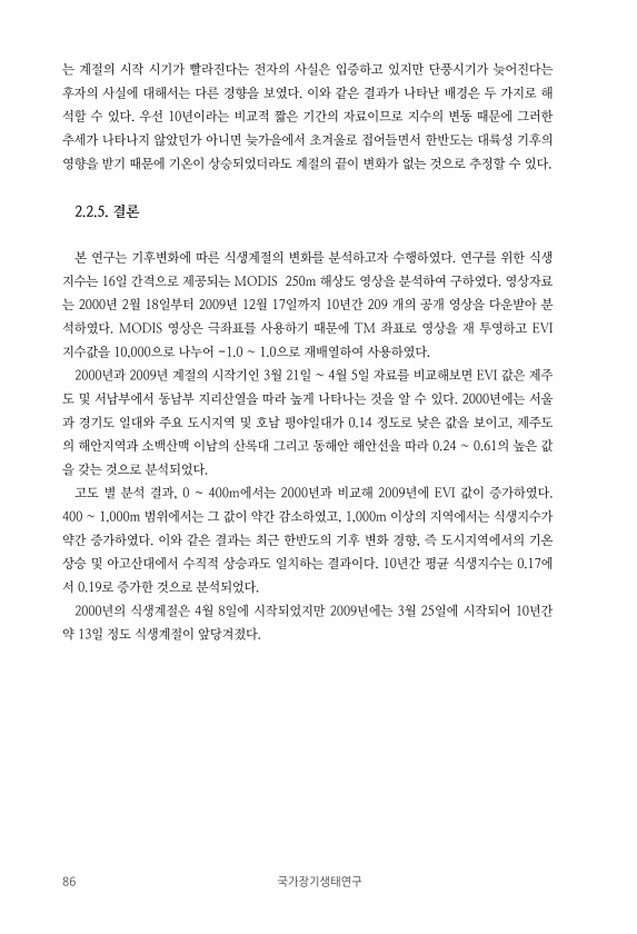 86 국가장기생태연구 는 계절의 시작 시기가 빨라진다는 전자의 사실은 입증하고 있지만 단풍시기가 늦어진다는 후자의 사실에 대해서는 다른 경향을 보였다. 이와 같은 결과가 나타난 배경은 두 가지로 해 석할 수 있다. 우선 10년이라는 비교적 짧은 기간의 자료이므로 지수의 변동 때문에 그러한 추세가 나타나지 않았던가 아니면 늦가을에서 초겨울로 접어들면서 한반도는 대륙성 기후의 영향을 받기 때문에 기온이 상승되었더라도 계절의 끝이 변화가 없는 것으로 추정할 수 있다. 2.2.5. 결론 본 연구는 기후변화에 따른 식생계절의 변화를 분석하고자 수행하였다. 연구를 위한 식생 지수는 16일 간격으로 제공되는 MODIS 250m 해상도 영상을 분석하여 구하였다. 영상자료 는 2000년 2월 18일부터 2009년 12월 1...