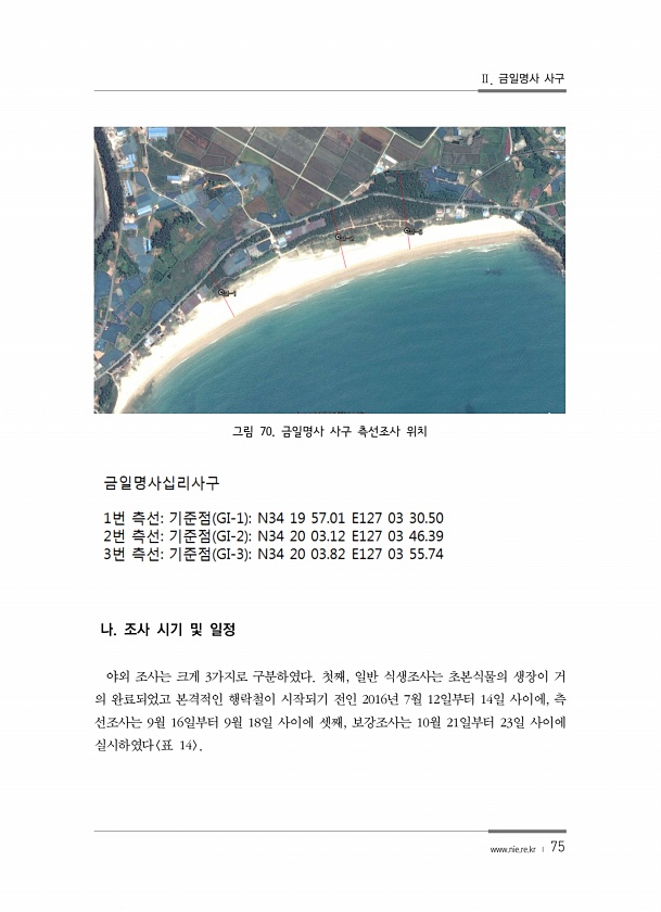 Ⅱ. 금일명사 사구 www.nie.re.kr ? 75 그림 70. 금일명사 사구 측선조사 위치 나. 조사 시기 및 일정 야외 조사는 크게 3가지로 구분하였다. 첫째, 일반 식생조사는 초본식물의 생장이 거 의 완료되었고 본격적인 행락철이 시작되기 전인 2016년 7월 12일부터 14일 사이에, 측 선조사는 9월 16일부터 9월 18일 사이에 셋째, 보강조사는 10월 21일부터 23일 사이에 실시하였다 표 14