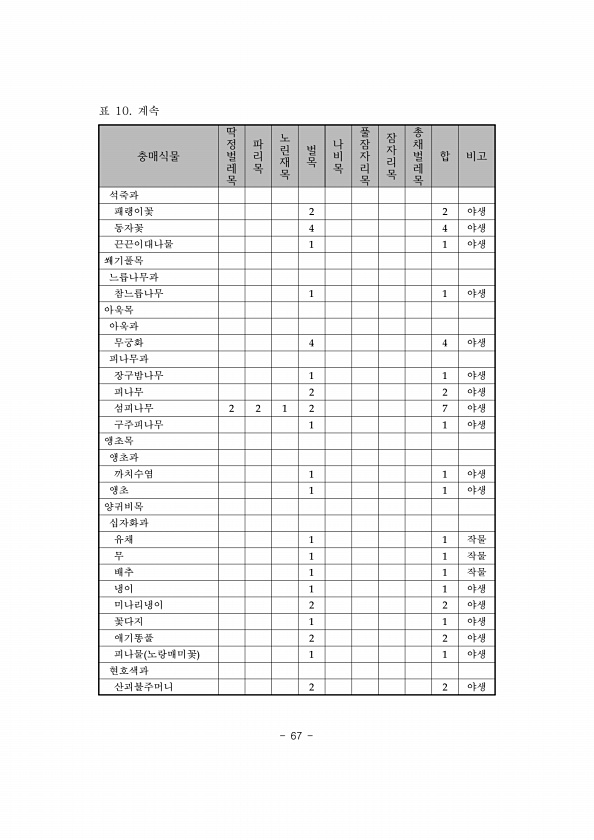 67 충매식물 딱정벌레목 파리목 노린재목 벌목 나비목 풀잠자리목 잠자리목 총채벌레목 합 비고 석죽과 패랭이꽃 2 2 야생 동자꽃 4 4 야생 끈끈이대나물 1 1 야생 쐐기풀목 느릅나무과 참느릅나무 1 1 야생 아욱목 아욱과 무궁화 4 4 야생 피나무과 장구밤나무 1 1 야생 피나무 2 2 야생 섬피나무 2 2 1 2 7 야생 구주피나무 1 1 야생 앵초목 앵초과 까치수염 1 1 야생 앵초 1 1 야생 양귀비목 십자화과 유채 1 1 작물 무 1 1 작물 배추 1 1 작물 냉이 1 1 야생 미나리냉이 2 2 야생 꽃다지 1 1 야생 애기똥풀 2 2 야생 피나물 노랑매미꽃 1 1 야생 현호색과 산괴불주머니 2 2 야생 표 10.계속