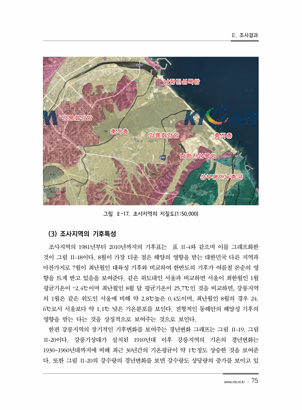 Ⅱ. 조사결과 www.nie.re.kr ? 75 그림 Ⅱ-17. 조사지역의 지질도 150,000 3 조사지역의 기후특성 조사지역의 1981년부터 2010년까지의 기후표는 표 Ⅱ-4와 같으며 이를 그래프화한 것이 그림 Ⅱ-18이다. 8월이 가장 더운 점은 해양의 영향을 받는 대한민국 다른 지역과 마찬가지로 7월이 최난월인 대륙성 기후와 비교하여 한반도의 기후가 여름철 몬순의 영 향을 트게 받고 있음을 보여준다. 같은 위도대인 서울과 비교하면 서울이 최한월인 1월 평균기온이 ?2.4℃이며 최난월인 8월 달 평균기온이 25.7℃인 것을 비교하면, 강릉지역 의 1월은 같은 위도인 서울에 비해 약 2.8℃높은 0.4도이며, 최난월인 8월의 경우 24. 6℃로서 서울보다 약 1.1℃ 낮은 기온분포를 보인다. 전형적인 ...