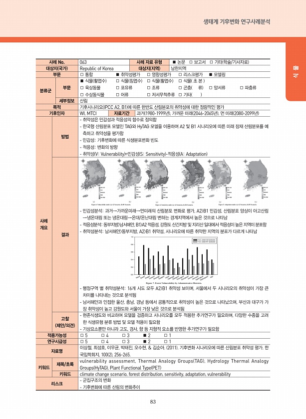 83 생태계 기후변화 연구사례분석 식 물 사례 No. 063 사례 자료 유형 ■ 논문 □ 보고서 □ 기타 학술/기사자료 대상지 국가 Republic of Korea 대상지 지역 남한지역 부문 □ 통합 ■ 취약성평가 □ 영향성평가 □ 리스크평가 ■ 모델링 분류군 부문 ■ 식물 활엽수 □ 식물 침엽수 □ 식물 활엽수 □ 식물 초 본 □ 육상동물 □ 포유류 □ 조류 □ 곤충 류 □ 양서류 □ 파충류 □ 수상동식물 □ 어류 □ 저서무척추류 □ 기타 세부정보 산림 목적 기후시나리오 IPCC A2, B1 에 따른 한반도 산림분포의 취약성에 대한 정량적인 평가 기후인자 WI, MTCI 자료기간 과거 1980-1999년 , 가까운 미래 2046-2065년 , 먼 미래 2080-2099년 사례 개요 방법 취약성은 민감성과 ...