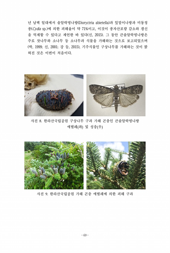년 남벽 일대에서 솔알락명나방 Dioryctria abietella 과 잎말이나방과 미동정 종 Cydia sp. 에 의한 피해율이 약 71%이고, 이것이 종자산포량 감소와 갱신 을 억제할 수 있다고 제언한 바 있다 신, 2015 그 동안 큰솔알락명나방은 주로 잣나무와 소나무 등 소나무과 식물을 가해하는 것으로 보고되었으며 박, 1999; 신, 2001; 강 등, 2015 , 기주식물인 구상나무를 가해하는 것이 밝 혀진 것은 이번이 처음이다. 사진 한라산국립공원 구상나무 구과 가해 곤충인 큰솔알락명나방 애벌레 좌 및 성충 우 사진 한라산국립공원 가해 곤충 애벌레에 의한 피해 구과 69