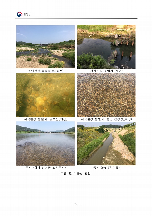 71 서식환경 불일치 대교천 서식환경 불일치 제천 서식환경 불일치 용수천_하상 서식환경 불일치 합강 캠핑장_하상 공사 합강 캠핑장_교각공사 공사 삼성천 상류 그림 39. 미출현원인.