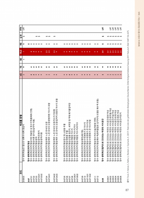 부록 1. 독일 절멸위험 비오톱 유형의 적색목록 출처Finck, P., Heinze, S., Raths, U., Riecken, U. Ssymank, A. 2017 Rote Liste der gef?hrdeten Biotoptypen Deutschlands. Dritte fortgeschriebene Fassung 2017.-Natursch. Biol. Vielf. 156, 637S. 코드 비오톱 유형 nG TE SE RLD RE § 30 FFH 24.06.03 정수 생태계/높은 염도의 내륙수/내륙 염습지 2 ? x 1 N § LRT 24.07 정수 생태계/인위적 형성 X 24.07.01 정수 생태계/인위적 형성/이탄 채굴장 내 정수지역 황폐화 진행 # # # X 24.07.02 정수 생태계/인위적 형성/어...