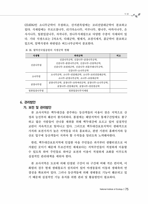 식 생 National Institute of EcologyⅠ75 23.65% 인 소나무군락이 우점하고, 산지관목림에는 꼬리진달래군락이 분포하고 있다. 식재림에는 루브르참나무, 리기다소나무, 미루나무, 밤나무, 아까시나무, 은 사시나무, 일본잎갈나무, 자작나무, 잣나무식재림으로 다양한 수종이 식재되어 있 다. 기타 식생으로는 2차초지, 다래군락, 벌채지, 조경식재지, 칡군락이 분포하고 있으며, 암벽식생과 하반림은 버드나무군락이 분포한다. 식생형 하위군락 비고 신갈나무림 신갈나무군락, 신갈나무-굴참나무군락, 신갈나무-졸참나무군락, 신갈나무-산철쭉군락, 신갈나무-조릿대군락, 신갈나무-쇠물푸레나무군락, 신갈나무-소나무군락 소나무림 소나무군락, 소나무-진달래군락, 소나무-꼬리진달래군락, 소나무-굴참나무군락, 소나무...