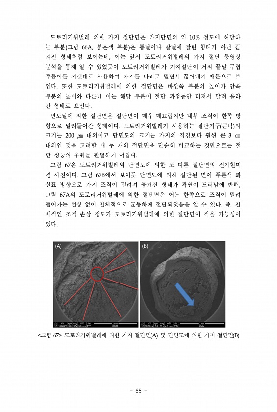 65 도토리거위벌레 의한 가지 절단면은 가지단면의 약 10% 정도에 해당하 는 부분 그림 66A, 붉은색 부분 은 톱날이나 칼날에 잘린 형태가 아닌 뜯 겨진 형태처럼 보이는데, 이는 앞서 도토리거위벌레의 가지 절단 동영상 분석을 통해 알 수 있었듯이 도토리거위벌레가 가지절단이 거의 끝날 무렵 주둥이를 지렛대로 사용하여 가지를 다리로 밀면서 끊어내기 때문으로 보 인다. 또한 도토리거위벌레에 의한 절단면은 바깥쪽 부분의 높이가 안쪽 부분의 높이와 다른데 이는 해당 부분이 절단 과정동안 터져서 말려 올라 간 형태로 보인다. 면도날에 의한 절단면은 절단면이 매우 매끄럽지만 내부 조직이 한쪽 방 향으로 밀려들어간 형태이다. 도토리거위벌레가 사용하는 절단기구 큰턱 의 크기는 200 ㎛ 내외이고 단면도의 크기는 가지의 ...