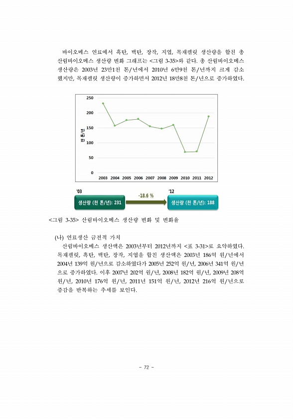 72 바이오메스 연료에서 흑탄, 백탄, 장작, 지엽, 목재펠릿 생산량을 합친 총 산림바이오메스 생산량 변화 그래프는 그림 3-35 와 같다. 총 산림바이오메스 생산량은 2003년 23만1천 톤/년에서 2010년 6만9천 톤/년까지 크게 감소 했지만, 목재펠릿 생산량이 증가하면서 2012년 18만8천 톤/년으로 증가하였다. 그림 3-35 산림바이오메스 생산량 변화 및 변화율 나 연료생산 금전적 가치 산림바이오메스 생산액은 2003년부터 2012년까지 표 3-31 로 요약하였다. 목재펠릿, 흑탄, 백탄, 장작, 지엽을 합친 생산액은 2003년 186억 원/년에서 2004년 139억 원/년으로 감소하였다가 2005년 252억 원/년, 2006년 341억 원/년 으로 증가하였다. 이후 2007년 202억 원/년, ...