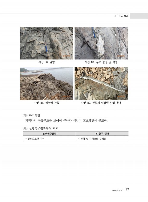 Ⅱ. 조사결과 www.nie.re.kr ? 77 사진 86. 규암 사진 87. 운모 결정 및 석영 사진 88. 석영맥 관입 사진 89. 판상의 석영맥 관입 확대 라 특기사항 퇴적암의 잔류구조를 보이며 규암과 셰일이 교호하면서 분포함. 마 선행연구결과와의 비교 선행연구결과 본 연구 결과 편암으로만 구성 편암 및 규암으로구성됨