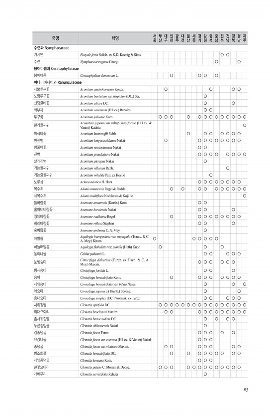 83 수련과 Nymphaeaceae 가시연 Euryale ferox Salisb. ex K.D. Koenig & Sims ○ ○ 수련 Nymphaea tetragona Georgi ○ ○ 붕어마름과 Ceratophyllaceae 붕어마름 Ceratophyllum demersum L. ○ ○ ○ ○ 미나리아재비과 Ranunculaceae 세뿔투구꽃 Aconitum austrokoreense Koidz. ○ ○ ○ ○ 노랑투구꽃 Aconitum barbatum var. hispidum DC. Ser. ○ 선덩굴바꽃 Aconitum ciliare DC. ○ ○ 백부자 Aconitum coreanum H.Lev. Rapaics ○ ○ 투구꽃 Aconitum jaluense Kom. ○ ○ ○ ○ ○ ○ ○ ○ ○ ...