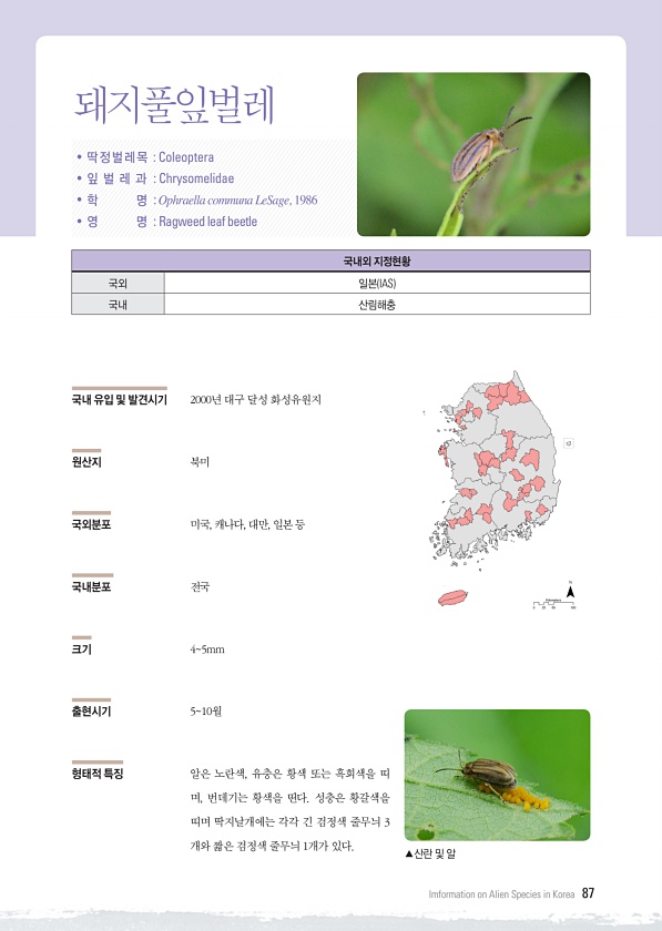 포유류 양서류 · 파충류 담수어류 곤충류 연체동물 외래식물 Imformation on Alien Species in Korea 87 국내 유입 및 발견시기 2000년 대구 달성 화성유원지 원산지 북미 국외분포 미국, 캐나다, 대만, 일본 등 국내분포 전국 크기 45mm 출현시기 510월 형태적 특징 알은 노란색, 유충은 황색 또는 흑회색을 띠 며, 번데기는 황색을 띤다. 성충은 황갈색을 띠며 딱지날개에는 각각 긴 검정색 줄무늬 3 개와 짧은 검정색 줄무늬 1개가 있다. ? 딱정벌레목 Coleoptera ? 잎 벌 레 과 Chrysomelidae ? 학 명 Ophraella communa LeSage, 1986 ? 영 명 Ragweed leaf beetle 국내외 지정현황 국외 일본 IAS 국내 산림해충 돼지...