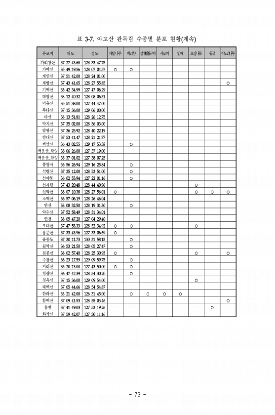 73 분포지 위도 경도 배암나무 백리향 섬매발톱군락 시로미 암매 요강나물 월귤 이노리나무 가리왕산 가야산 개인산 계방산 기백산 대암산 덕유산 두타산 마산 박지산 발왕산 방태산 백암산 백운산 광양 백운산 함양 불영사 석병산 선야봉 선자령 설악산 소백산 안산 약수산 연천 오대산 용문산 울릉도 월악산 점봉산 주왕산 지리산 청량산 청옥산 태백산 한라산 함백산 홍천 화악산 표 아고산 관목림 수종별 분포 현황계속