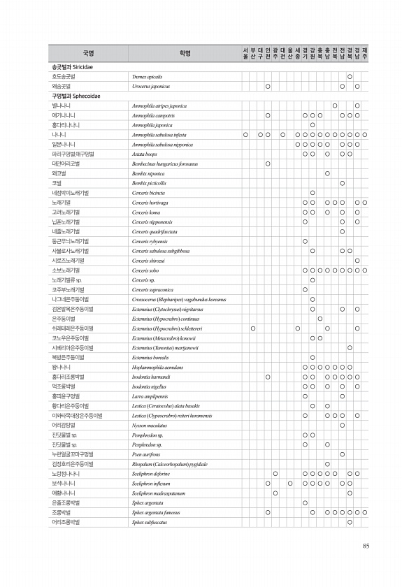 85 송곳벌과 Siricidae 호도송곳벌 Tremex apicalis ○ 왜송곳벌 Urocerus japonicus ○ ○ ○ 구멍벌과 Sphecoidae 별나나니 Ammophila atripes japonica ○ ○ 애기나나니 Ammophila campotris ○ ○ ○ ○ ○ ○ ○ 홍다리나나니 Ammophila japonica ○ 나나니 Ammophila sabulosa infesta ○ ○ ○ ○ ○ ○ ○ ○ ○ ○ ○ ○ ○ ○ 일본나나니 Ammophila sabulosa nipponica ○ ○ ○ ○ ○ ○ ○ ○ 파리구멍벌,애구멍벌 Astata boops ○ ○ ○ ○ ○ 대만어리코벌 Bembecinus hungaricus forosanus ○ 왜코벌 Bembix niponica ○ 코...