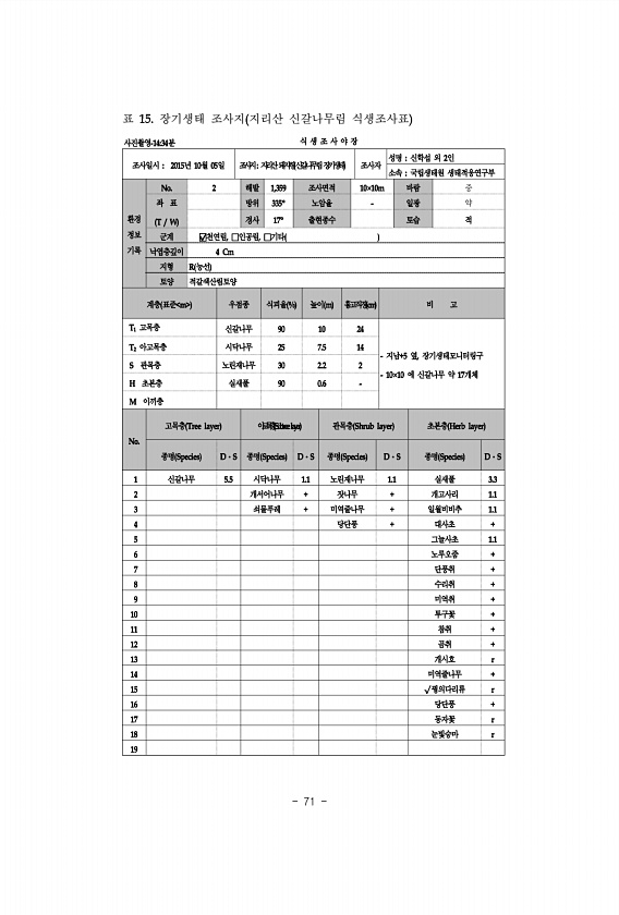 71 사진촬영 분 식 생 조 사 야 장 조사일시 년 월 일 조사지 지리산돼지령신갈나무림장기생태 조사자 성명 신학섭 외 인 소속 국립생태원 생태적응연구부 환경 정보 기록 해발 조사면적 바람 중 좌 표 방위 노암율 일광 약 경사 출현종수 토습 적 군계 천연림 인공림 기타 낙엽층깊이 지형 능선 토양 적갈색산림토양 계층 표준 우점종 식피율 높이 흉고직경 비 고 고목층 신갈나무 지남 옆 장기생태모니터링구 에 신갈나무 약 개체 아고목층 시닥나무 관목층 노린재나무 초본층 실새풀 이끼층 고목층 아고목층 관목층 초본층 종명 종명 종명 종명 신갈나무 시닥나무 노린재나무 실새풀 개서어나무 잣나무 개고사리 쇠물푸레 미역줄나무 일월비비추 당단풍 대사초 그늘사초 노루오줌 단풍취 수리취 미역취 투구꽃 참취 곰취 개시호 미역줄나무 꿩의...