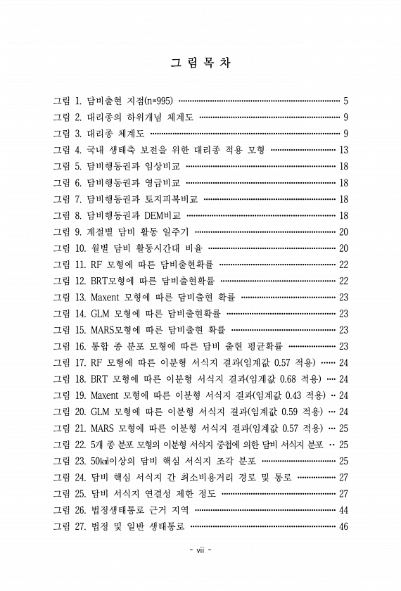 vii 그 림 목 차 그림 1. 담비출현 지점 n=995 ········································································5 그림 2. 대리종의 하위개념 체계도 ·······························································9 그림 3. 대리종 체계도 ·····················································································9 그림 4. 국내 생태축 보전을 위한 대리종 적용 모형 ·····························13 그림 5. 담비행동권과 임상비교 ····························...