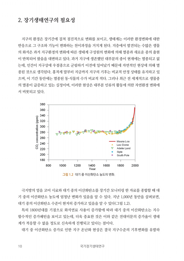10 국가장기생태연구 2. 장기생태연구의 필요성 지구의 환경은 장기간에 걸쳐 점진적으로 변화를 보이고, 생태계는 이러한 환경변화에 대한 반응으로 그 구조와 기능이 변화하는 천이과정을 거치게 된다. 지층에서 발견되는 수많은 생물 의 화석은 과거 지구환경의 변화에 따른 생태계 구성원의 변화에 의해 멸종과 새로운 종의 출현 이 반복되어 왔음을 대변하고 있다. 과거 지구에 생존했던 대부분의 종이 현재에는 멸종되고 없 는데, 인간이 지구상에 우점종으로 군림하기 이전에 일어났기 때문에 자연적인 현상에 의해 멸 종된 것으로 생각된다. 홍적세 말부터 지금까지 지구의 기후는 비교적 안정 상태를 유지하고 있 으며, 이 기간 동안에는 멸종된 동·식물의 수가 비교적 적다. 그러나 최근 전 세계적으로 생물종 의 멸종이 급증하고 있...